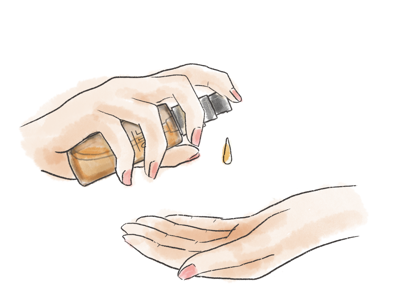 オレンジラフィーオイル*はしばらくすると肌になじみます。肌のコンディションに合わせて使用量を調節してください。